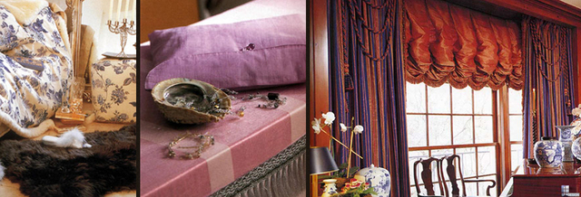 Ворсистый бархат и уютная синель тот час же придают красоту и богатство дивану и однотонным шторам, завораживая великолепием серебристых оттенков, которые так эффектно меняют цвет в зависимости от вашего источника освещения — солнце за окном, электричество или свечи. Шелк и атлас вносят превосходный контраст фактур благодаря своей сияющей игре со светом, так что, используя их для разбросанных подушек, покрывал, обивки спинки кровати и также для ошеломительного балдахина супер — кровати, вы добьетесь атмосферы такой богатой роскоши, которая, пожалуй, пришлась бы по вкусу самой Марии-Антуанетте. Теперь подбирайте мерцающую органзу и тончайшие легчайшие ткани для шикарного бального наряда ваших окон взамен невзрачной тюлевой сетки. И никогда не забывайте, что рисунок вообще лучше всего свести к минимуму.