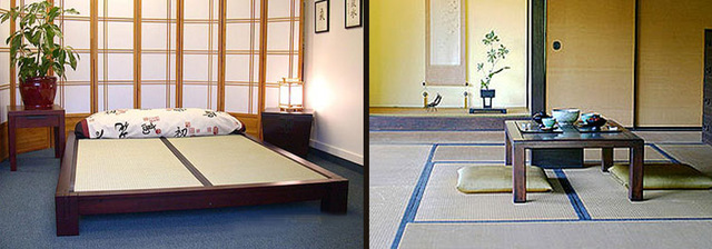 • приветствуются всевозможные ковры и циновки с характерными восточными мотивами: иероглифы, изображения листьев или цветов. Текстиль преимущественно натуральный - хлопок и шелк, как правило, естественных тонов;
